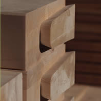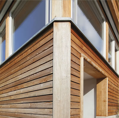 Um den Werkstoff Holz noch berechenbarer und belastbarer zu machen, werden Bretter im Verbund verwendet: Nur der Länge nach verleimt spricht man von Leimbindern, 24 cm breiten und bis zu zwei Meter hohen Balken für Holzträger bis 50(!) Meter Länge. Bei der Massivholzplatte, verleimt oder mit Holzdübeln verbunden, werden die (meist drei) Lagen jeweils um 90 Grad versetzt. Auch diese Baumaterialien stammen ausschließlich von österreichischen Herstellern. Lediglich bei Holzfaserplatten wird im Einzelfall Importware verwendet.