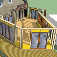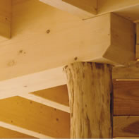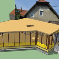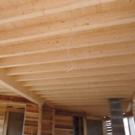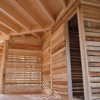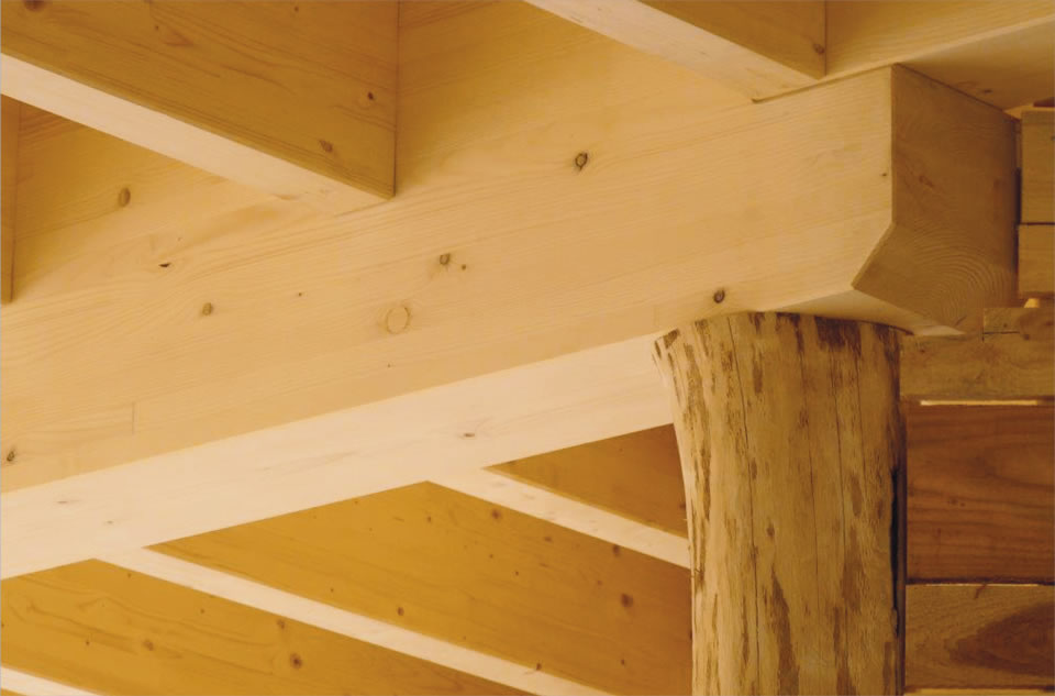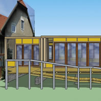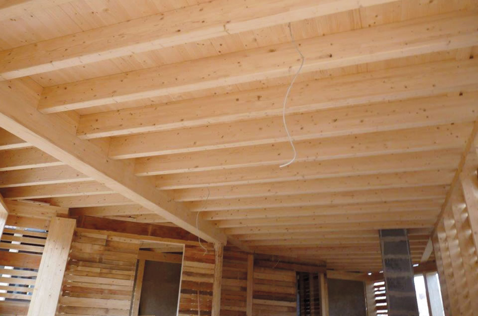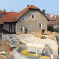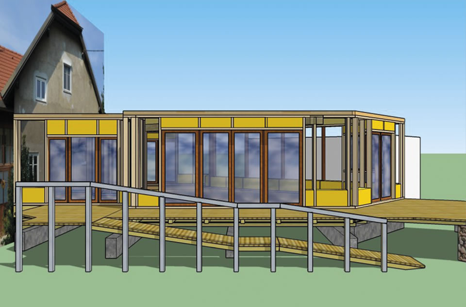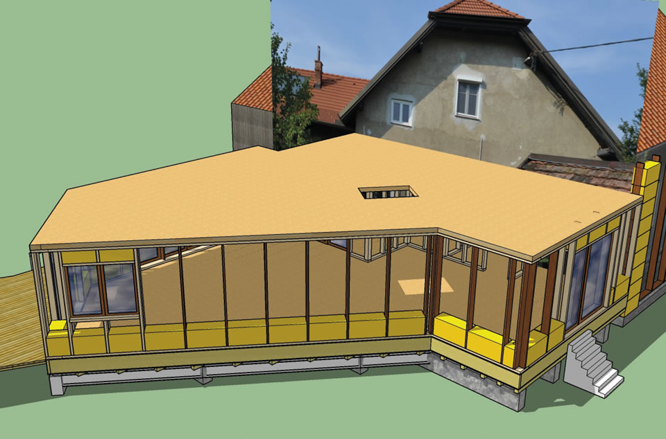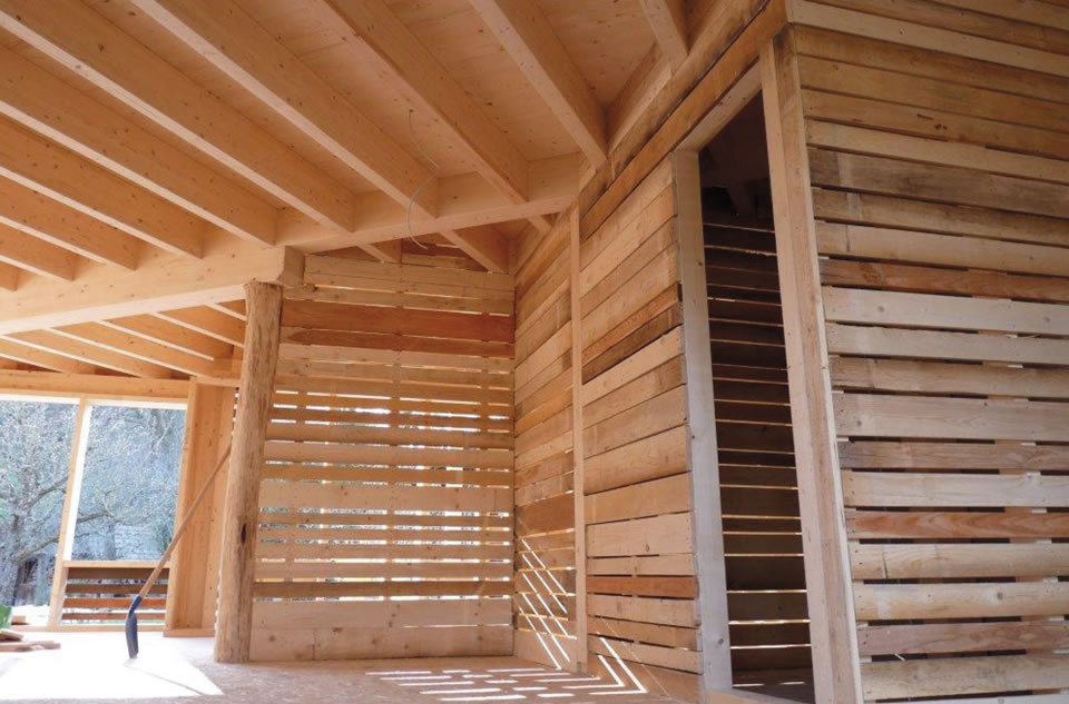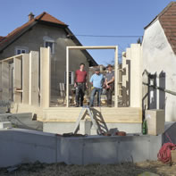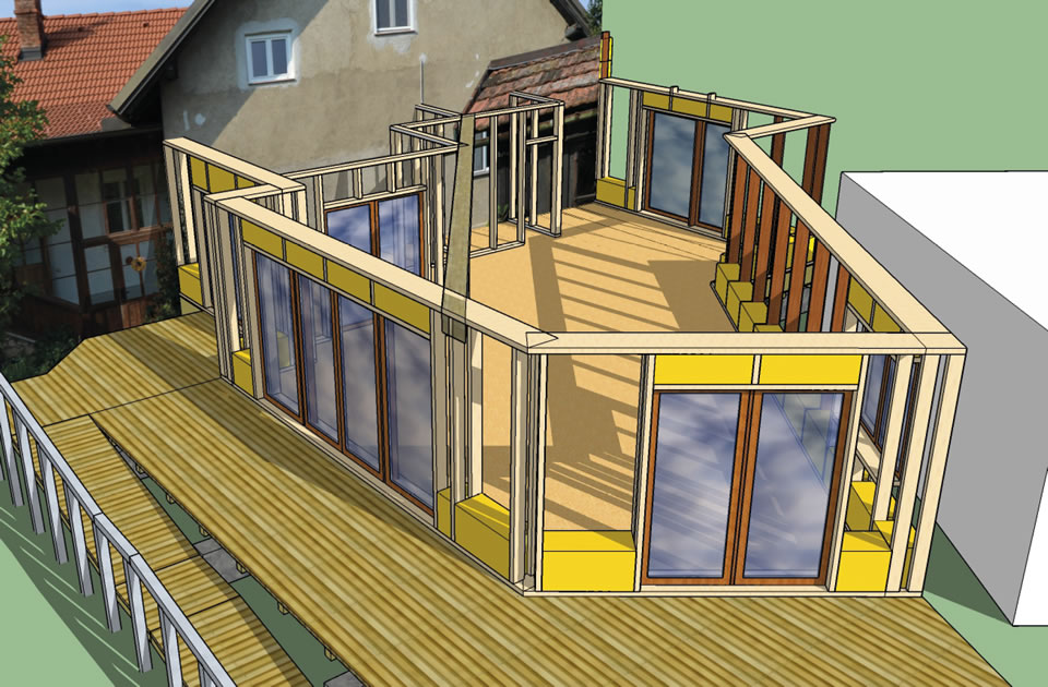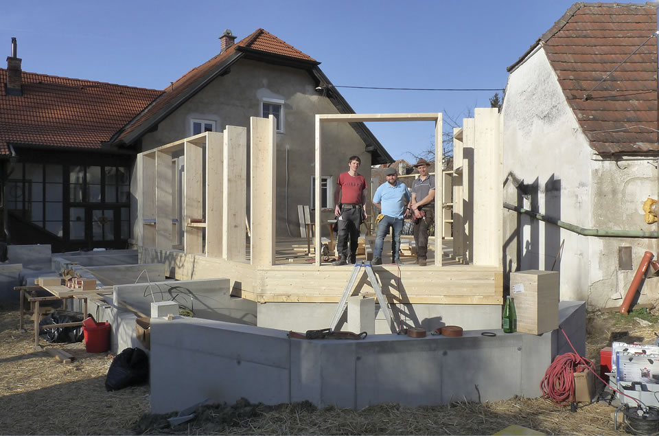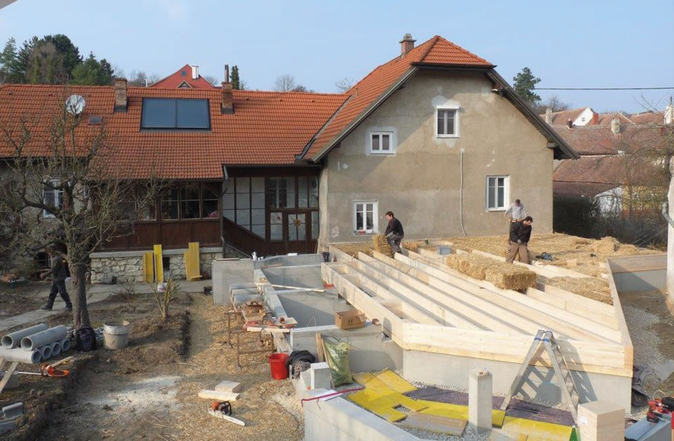 Das Projekt: ein bungalowartiger Zubau mit großzügiger Terrasse in moderner Formensprache und ökologischer Bauweise. Dazu wurde eine Bodenplatte aus Holz auf Streifenfundamente aufgelegt und darauf die Außenwände in Holzriegelbauweise errichtet. Gedämmt wurde mit Baustrohballen von Johannes Erlinger, das Einfüllen übernahm Strohnatur. Zur Freude des Zimmermanns durfte die Tramdecke sichtbar bleiben, da sie sich in diesem Fall als kostengünstiger erwies. Die Wände erhielten einen Lehmverputz innen, außen wurde teilweise mit Kalk verputzt bzw. mit Holz verschalt. Den optischen Blickfang bildet zur großen Freude der Baufamilie die Eichenstütze, die der Bauherr aus seinem eigenen Wald geholt hatte (das war eine spontane Idee von Erlinger während der Montage).