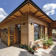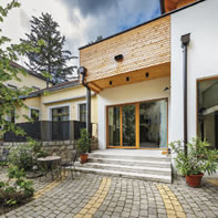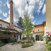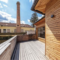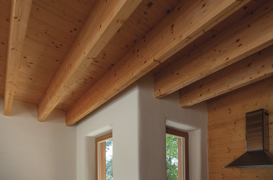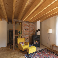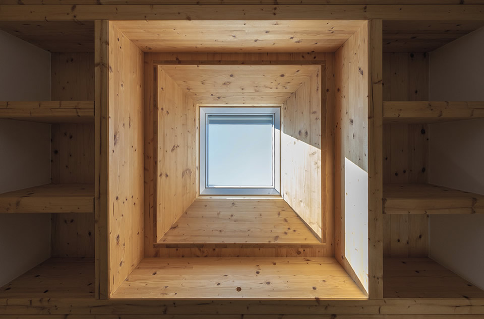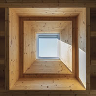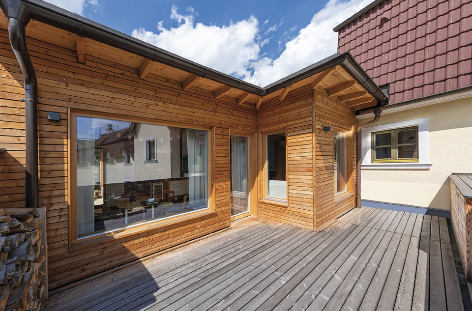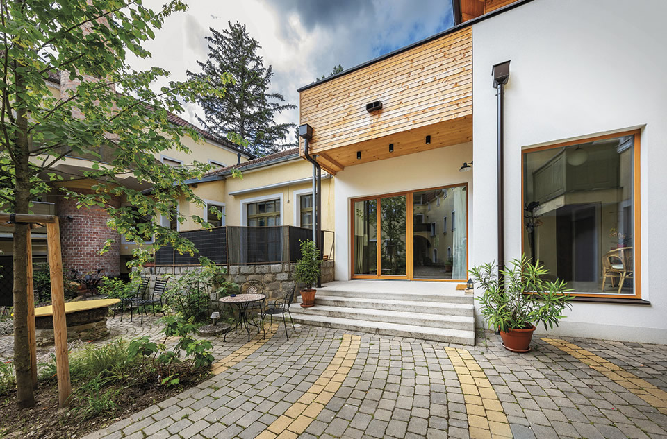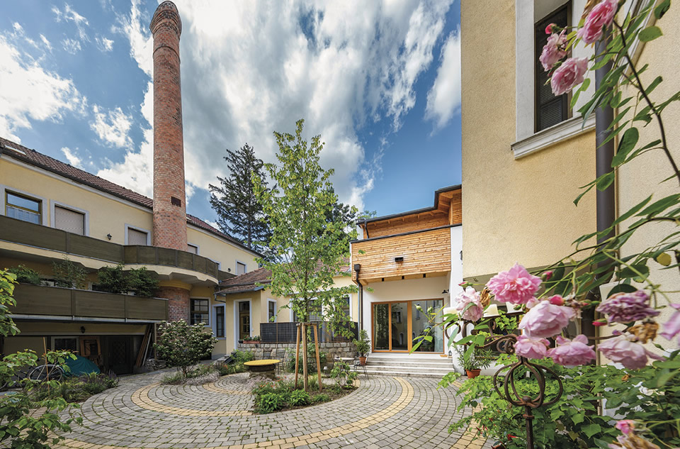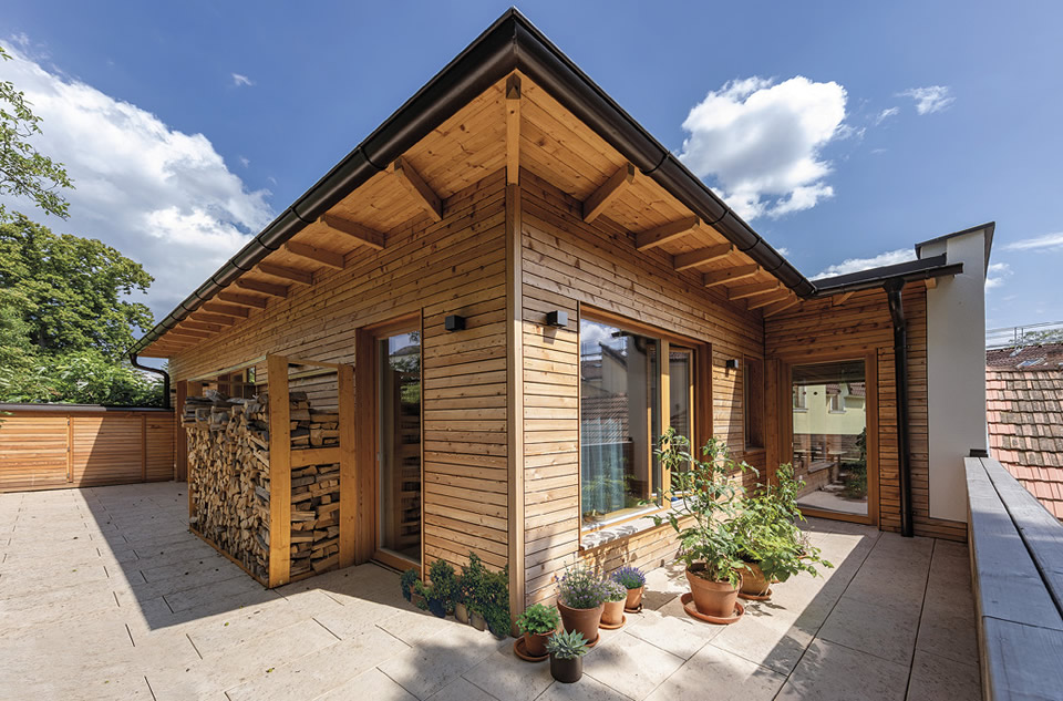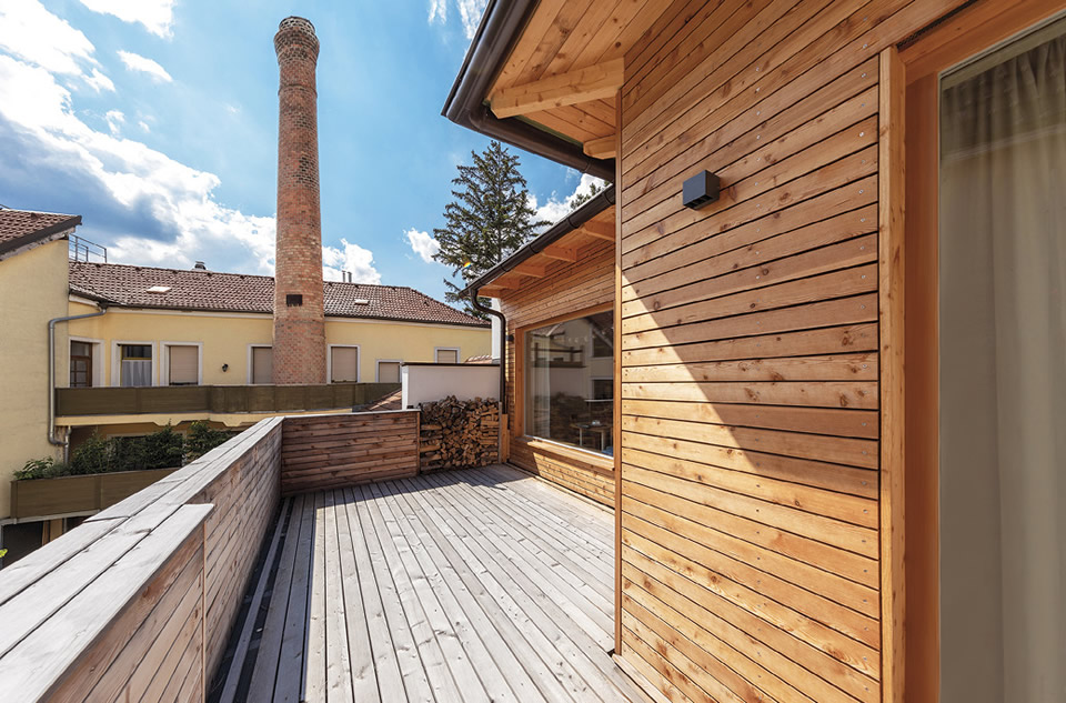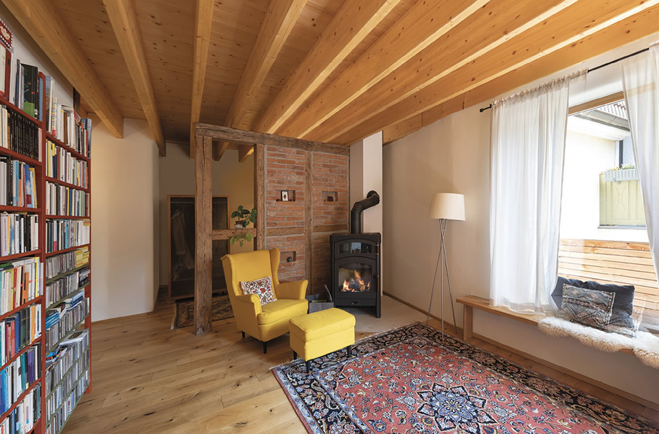 Am Betriebsgelände einer ehemaligen Bäckerei sollte ein Gebäude ein Obergeschoß bekommen. Da durch das Eingangstor der Anlage kein Kran passte, musste alles händisch bewegt werden; der schwerste Bauteil wog 250 kg und war zu viert gerade noch handelbar. Der Dachstuhl wurde abgetragen, Altholz-Trame (auch tragend) wiederverwendet und sichtbar verbaut, u.a. als Teil einer Ziegelwand. Für die Geschoßdecke wurden 20 m2 Fichte verarbeitet mit oben schwimmendem Estrich – ein schalltechnisch entkoppelter Fußbodenaufbau, um die Musikproberäume im EG akustisch zu isolieren. Das OG bekam eine Holzfassade mit Strohdämmung, innen wurde mit Lehm verputzt. Ein konisches Oberlicht sorgt für natürliche Helligkeit im Bad.