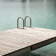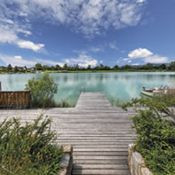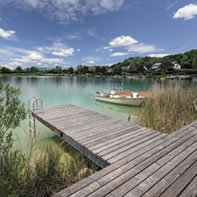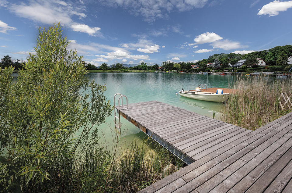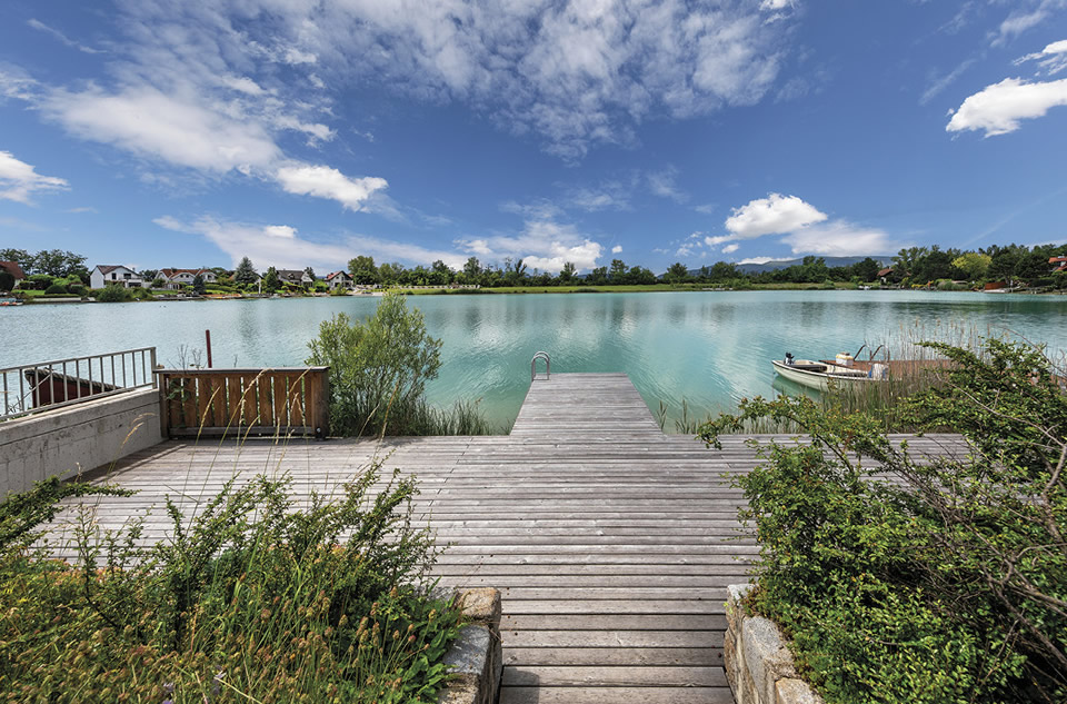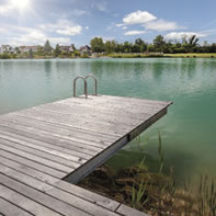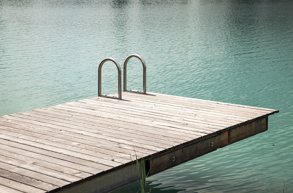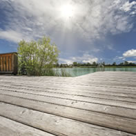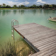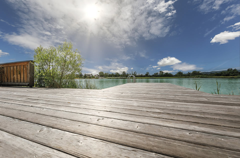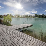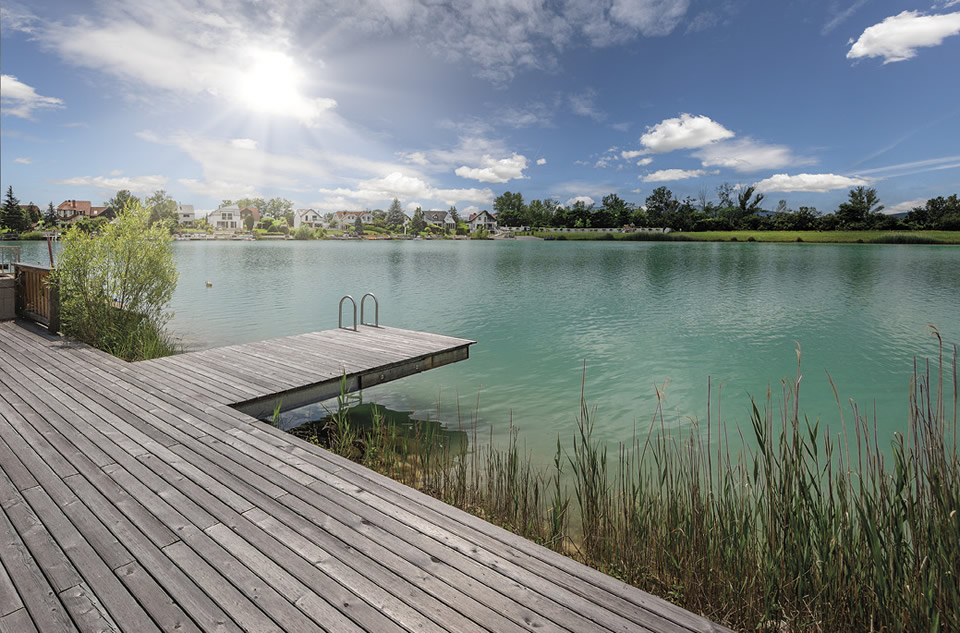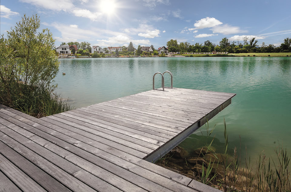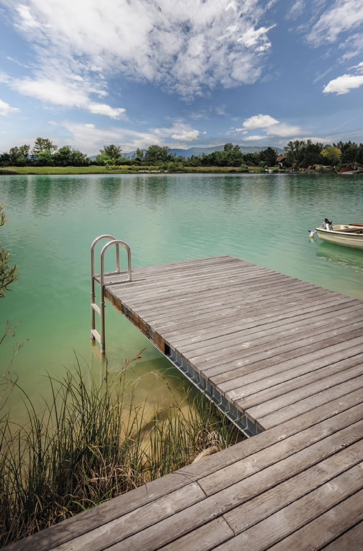 Dieser schön silbrig vergraute Badesteg an einem der zahlreichen Teiche in der Gemeinde Oberwaltersdorf wurde aus gehobelten Lärchenbrettern gefertigt. Der ins Wasser ragende Kopfteil kragt ca. 4 m2 frei aus.