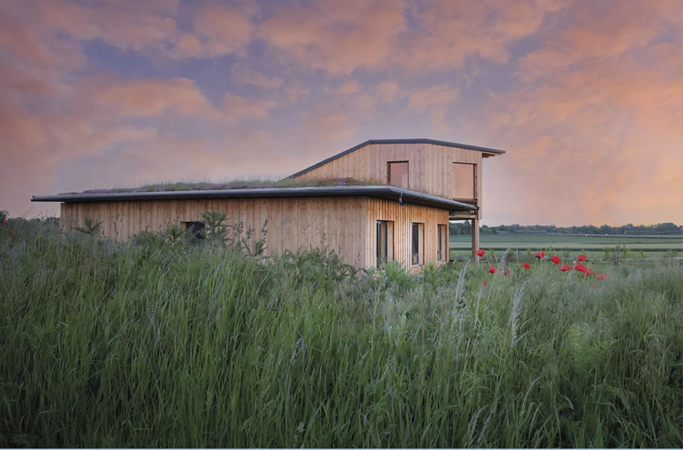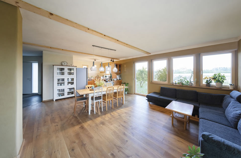 Die fünfköpfige Baufamilie betreibt eine Biolandwirtschaft im Marchfeld und benötigte deutlich mehr Wohnraum. Man entschied sich für eine vollökologische Holzriegelbauweise mit Strohdämmung, Lehmputz innen und Kalkputz außen sowie einem Gründach im eingeschoßigen Bereich. Da der Bauherr zusätzlich zur Arbeit am Hof viel Eigenleistung erbringen wollte, belief sich die Gesamtbauzeit auf drei Jahre.