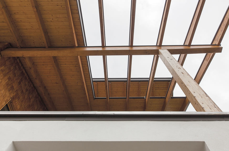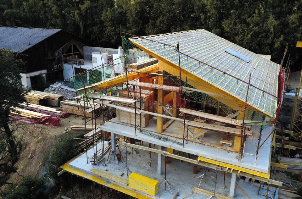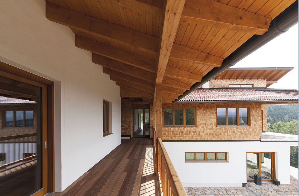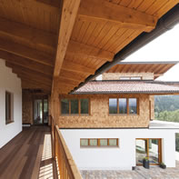 Das Bauvorhaben umfasste den Umbau eines Bürogebäudes und den Neubau eines Einfamilienhauses. Laut Plan wären die beiden Gebäude mit unterschiedlichen Dachhöhen unverbunden geblieben und hätten einen trichterförmigen Schnitt (Kreuzriss) ergeben. Erlinger Holzbau realisierte stattdessen einen Laubengang, eine Eingangs-Überdachung sowie Lösungen für den Wand- und Dachaufbau, die sich zu einem harmonischen Ganzen fügen und eine deutliche funktionelle Verbesserung bedeuten.
