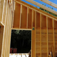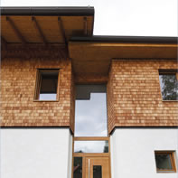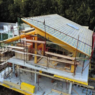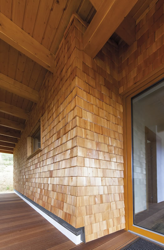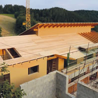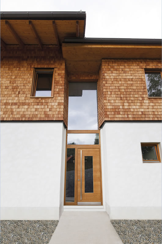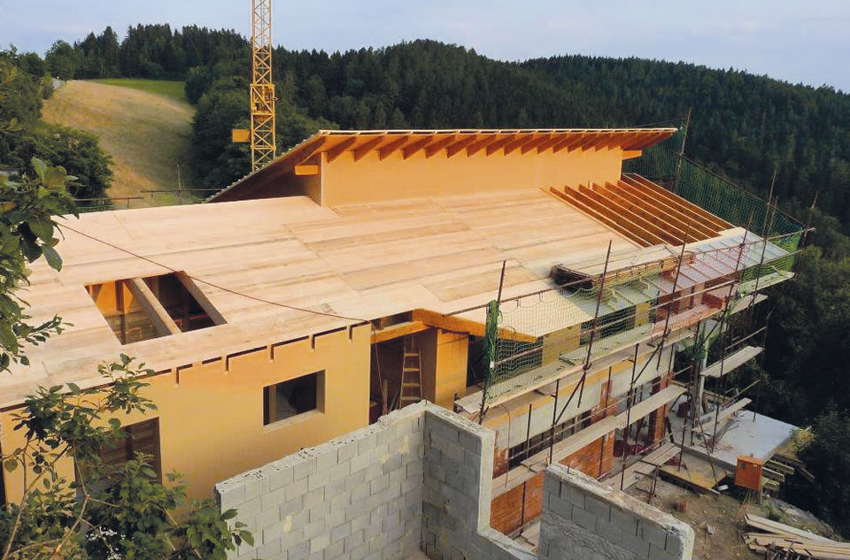 Das Bauvorhaben umfasste den Umbau eines Bürogebäudes und den Neubau eines Einfamilienhauses. Laut Plan wären die beiden Gebäude mit unterschiedlichen Dachhöhen unverbunden geblieben und hätten einen trichterförmigen Schnitt (Kreuzriss) ergeben. Erlinger Holzbau realisierte stattdessen einen Laubengang, eine Eingangs-Überdachung sowie Lösungen für den Wand- und Dachaufbau, die sich zu einem harmonischen Ganzen fügen und eine deutliche funktionelle Verbesserung bedeuten.