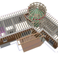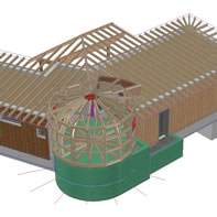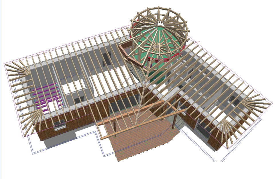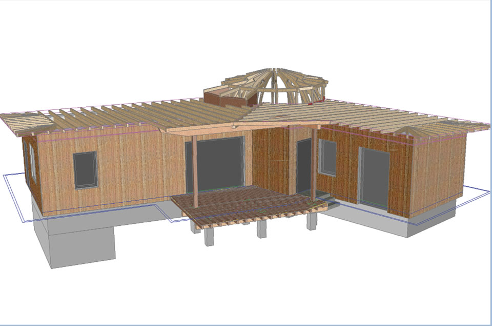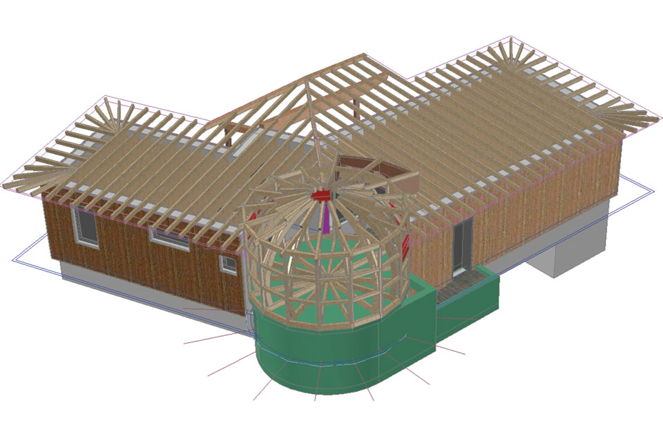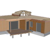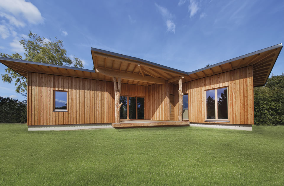 Um einen bestehenden 16-eckigen Bauteil plante der Bauherr selbst ein einstöckiges Einfamilienhaus aus zwei rechteckigen, um 30° versetzten Bauteilen. Die Spitze des flach pfeilförmigen Grundrisses wird vom halb umbauten 16-Eck gebildet, im nach Süden orientierten Innenwinkel sorgt eine überdachte Terrasse für ins Außen erweiterten Wohnkomfort. Wände und Dach wurden derart mit Holzriegelkonstruktionen ausgeführt, dass wie vorgesehen Baustrohballen zur vollökologischen Dämmung eingebracht werden konnten.