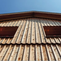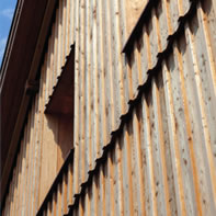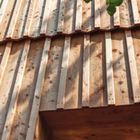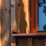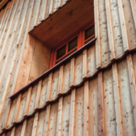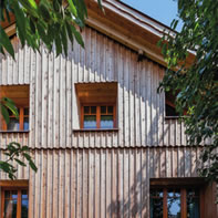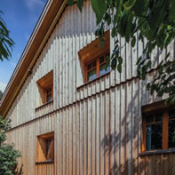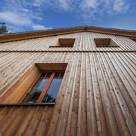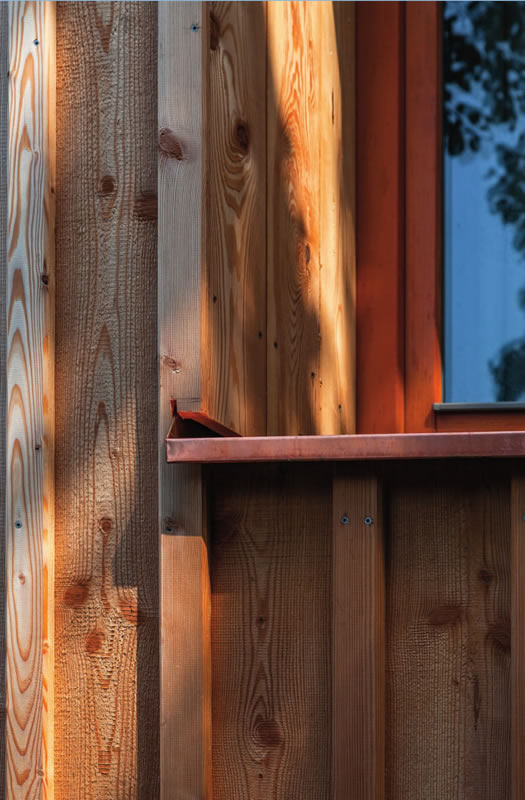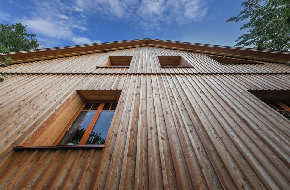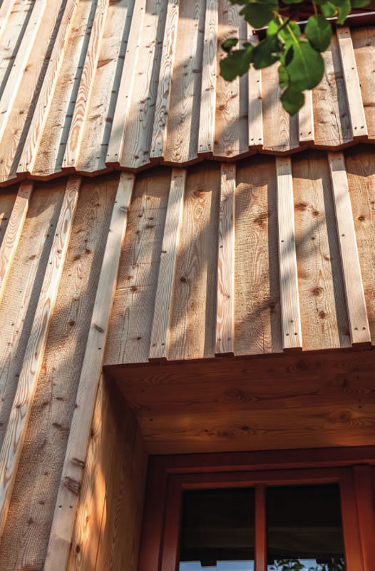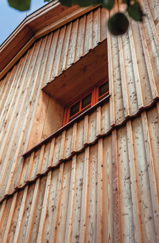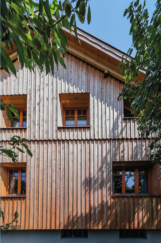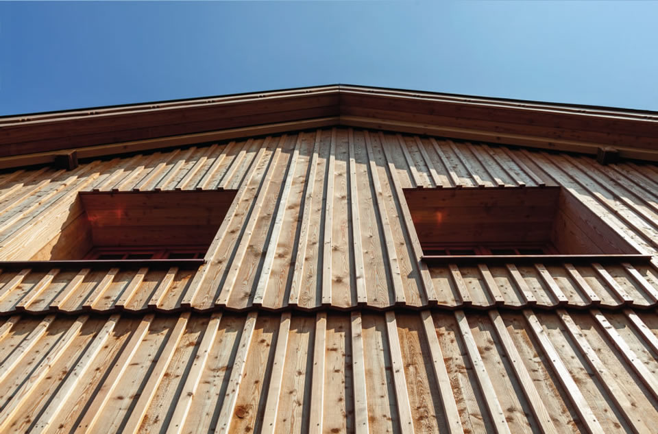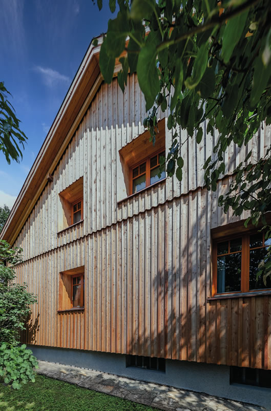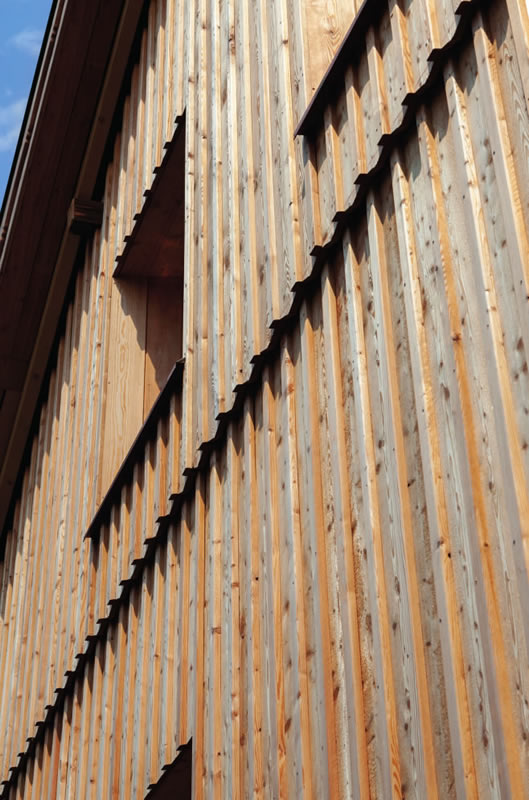 Für die Fassade wurde eine Unterkonstruktion aus 6 × 14-cm-Holzstaffeln auf den Putz gedübelt. Darauf wurde die Lärchenholzverschalung angebracht: 18 cm breite Grundbretter (sägerau, gebürstet) und 6 cm breite Deckleisten (gehobelt, Kanten gefast). Als optische Besonderheiten wurden die obere Hälfte der Verschalung auf Höhe der Geschoßdecke angespitzt ausgeführt und die Fensterlaibungen konisch, sodass sich der Blick von innen nach außen weitet.