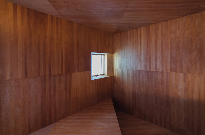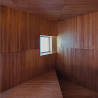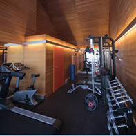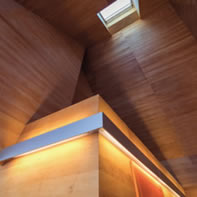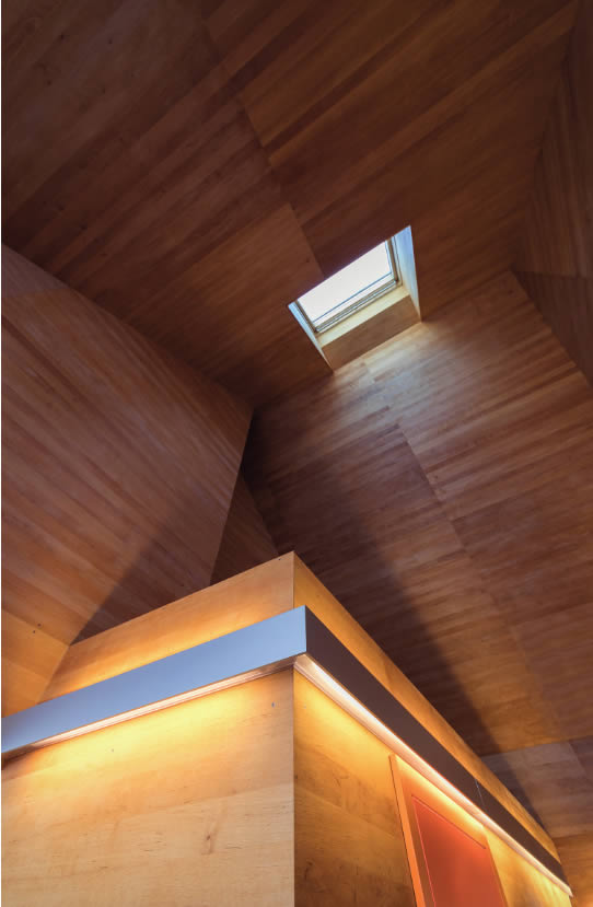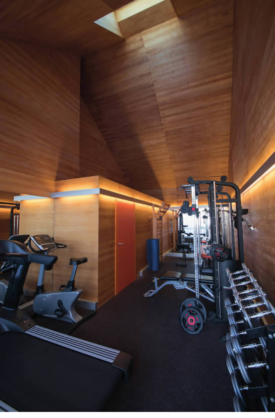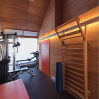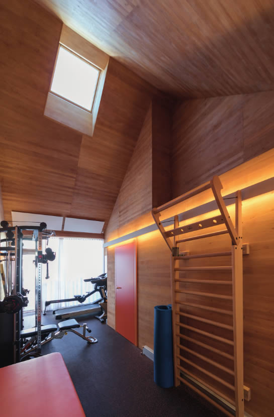 Der 6 Meter hohe Fitness„raum“ ist tatsächlich ein komplettes Gebäude, das die auftraggebende Firma für die aktive Erholung ihrer Mitarbeiter umgestalten ließ. Der Baukörper wurde ortstypisch ausgeführt mit steilem Satteldach (Massivholzplatte. Von diesem innen sichtbaren Bauteil ausgehend entstand der Wunsch nach einer vollständigen Holzvertäfelung; 160 m2 Erlen Dreischichtplatten waren dafür erforderlich. Wie auch die Innentür „fast schon Tischlerarbeit“.