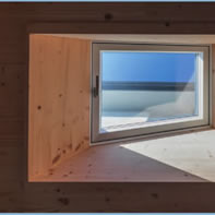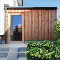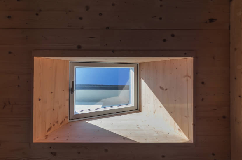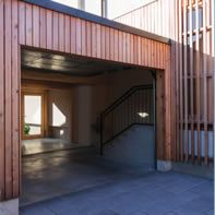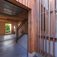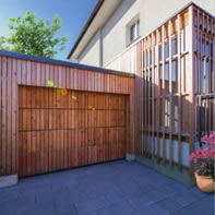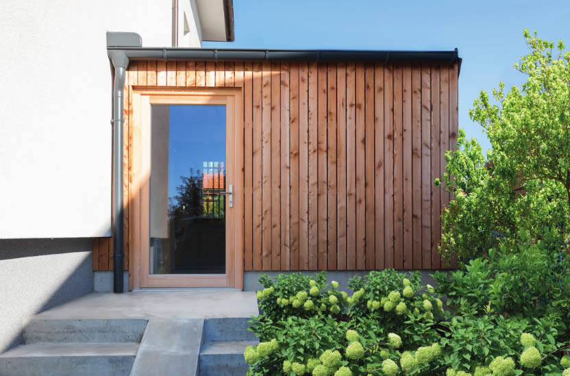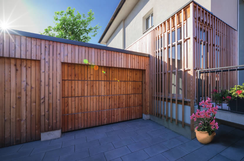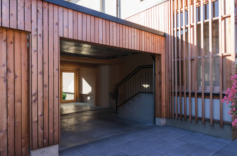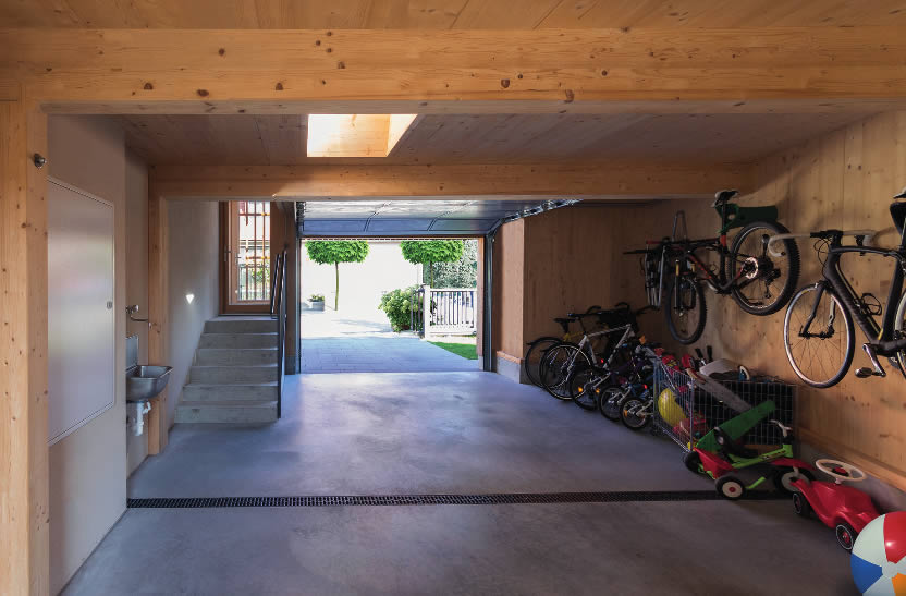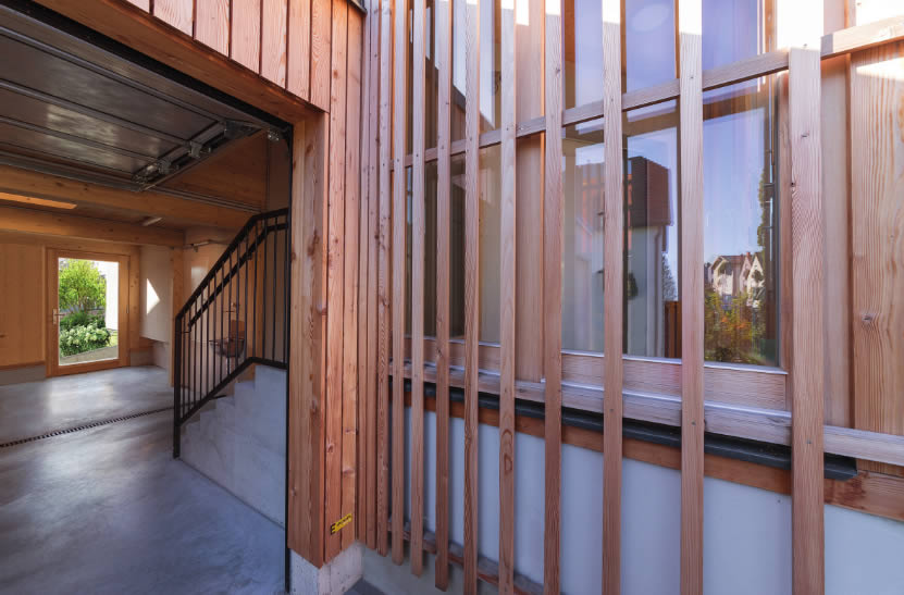 Alle Holzoberflächen sind sichtbar: Fassade und sowohl das zweiflügelige Tor des Müllabstellplatzes links als auch das Sektionaltor der eigentlichen Garage rechts wurden in Lärche, die Innenverkleidung in Fichte ausgeführt. Gefühlt fährt der Bauherr so „mit dem Auto ins Wohnzimmer“.