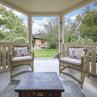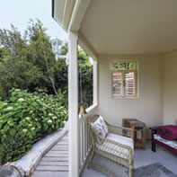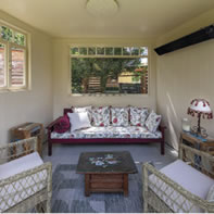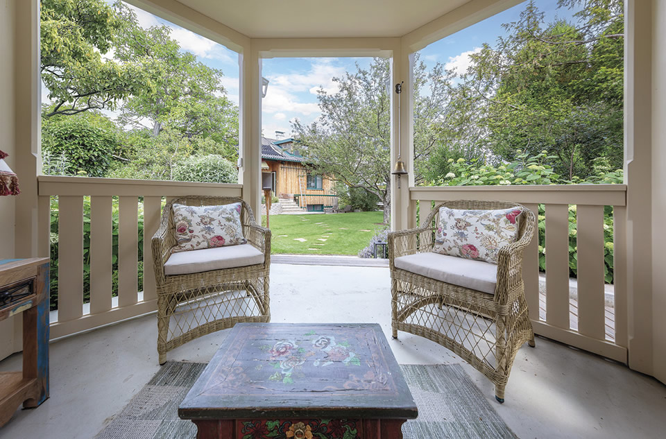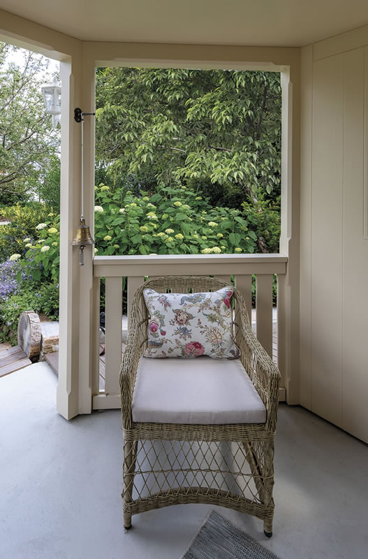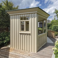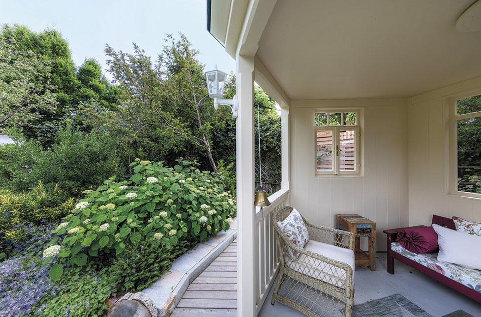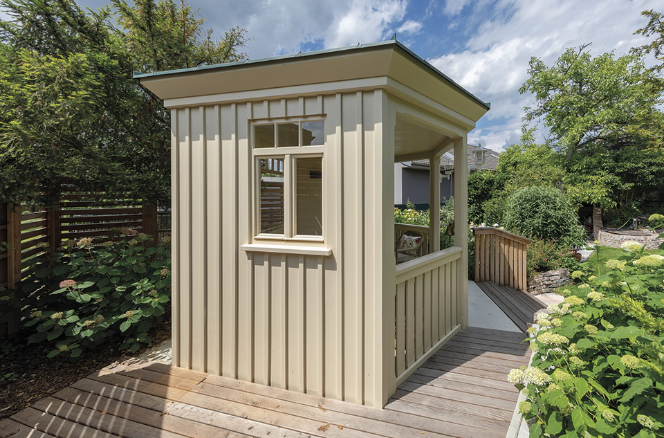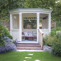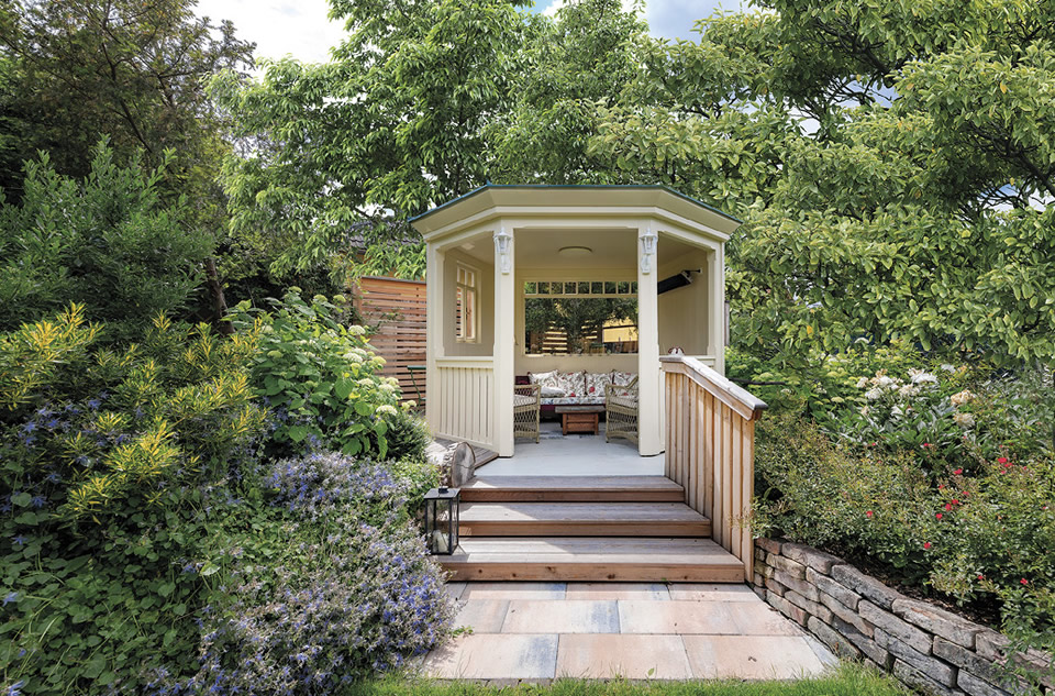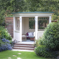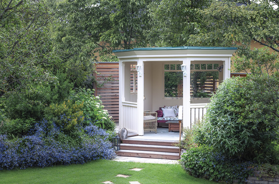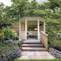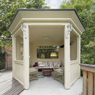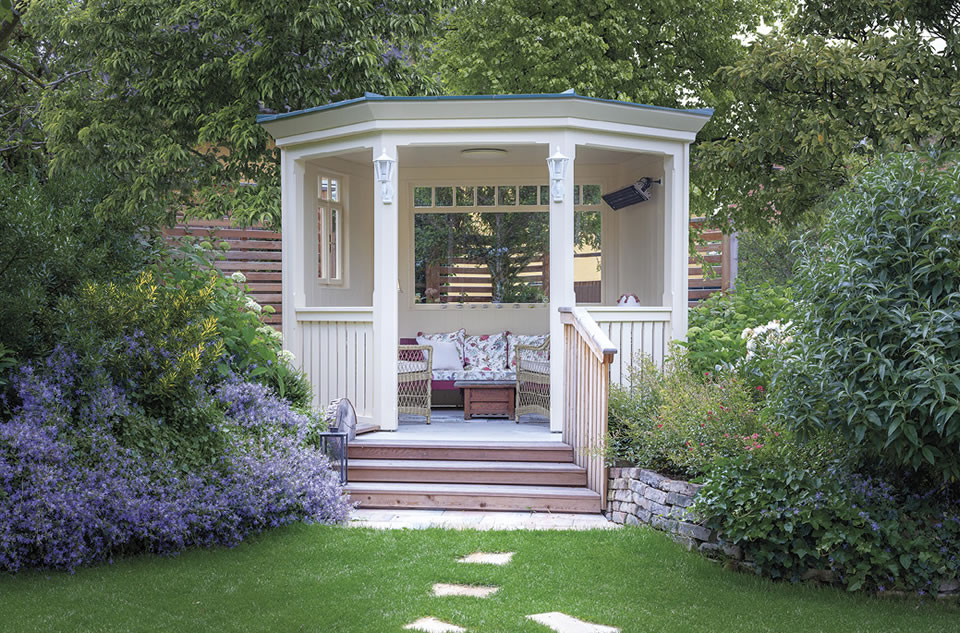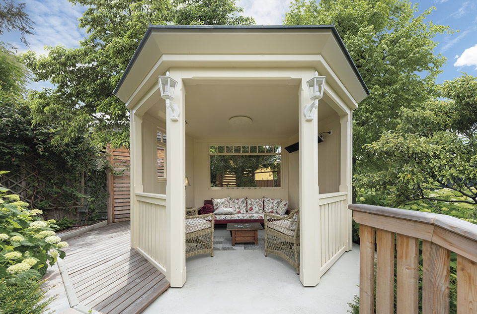 Der berühmte, kürzlich restaurierte Musikpavillon von Baden stand Pate für dieses Projekt mit dem erklärten Ziel, einen besonderen Blickfang zu schaffen. Entstanden ist eine Huldigung an die Schönheit im Geiste einer exklusiven „labour of love“, wie man im englischen Sprachraum sagt. Der Bauplatz war vorgegeben, was erforderte, den Grundriss als unregelmäßiges Sechseck anzulegen. Der Pavillon wurde in Fichte ausgeführt und mit der besonders langlebigen norwegischen Holzfarbe in „Elfenbeinweiß“ gestrichen. Stiege und Handlauf sind Lärche natur. Dank eines Heizstrahlers ist der Pavillon ganzjährig nutzbar als edler Rahmen für die Ausübung der Kunst der Muße.