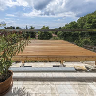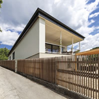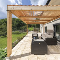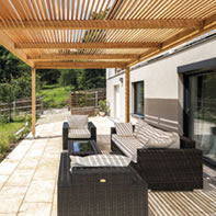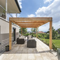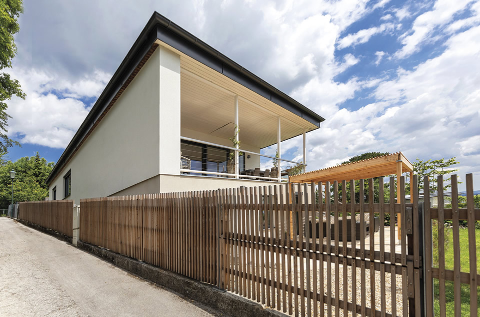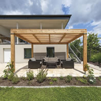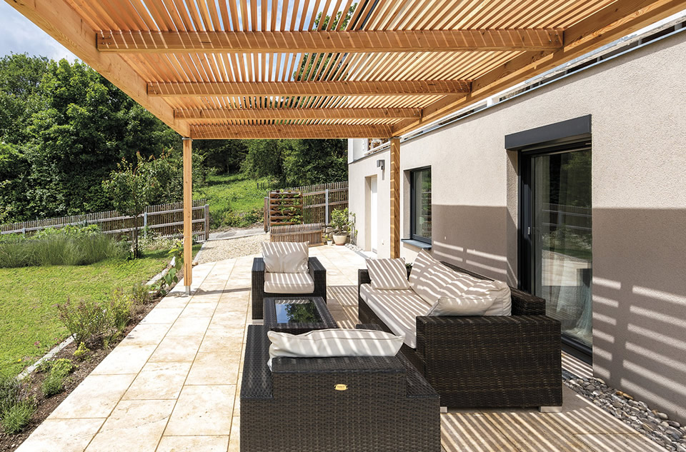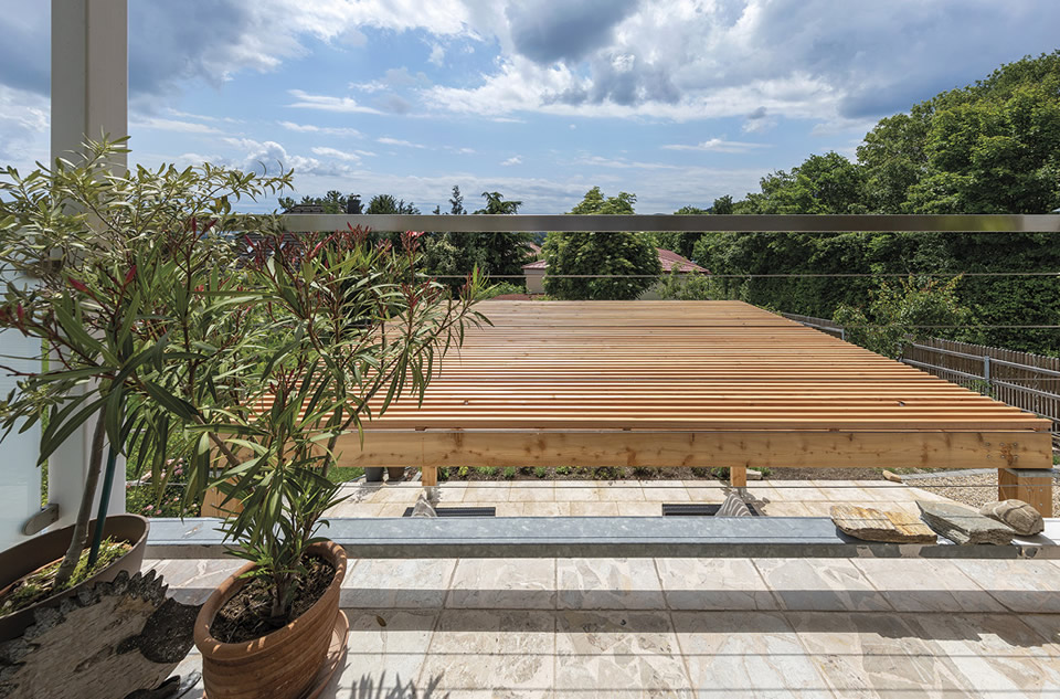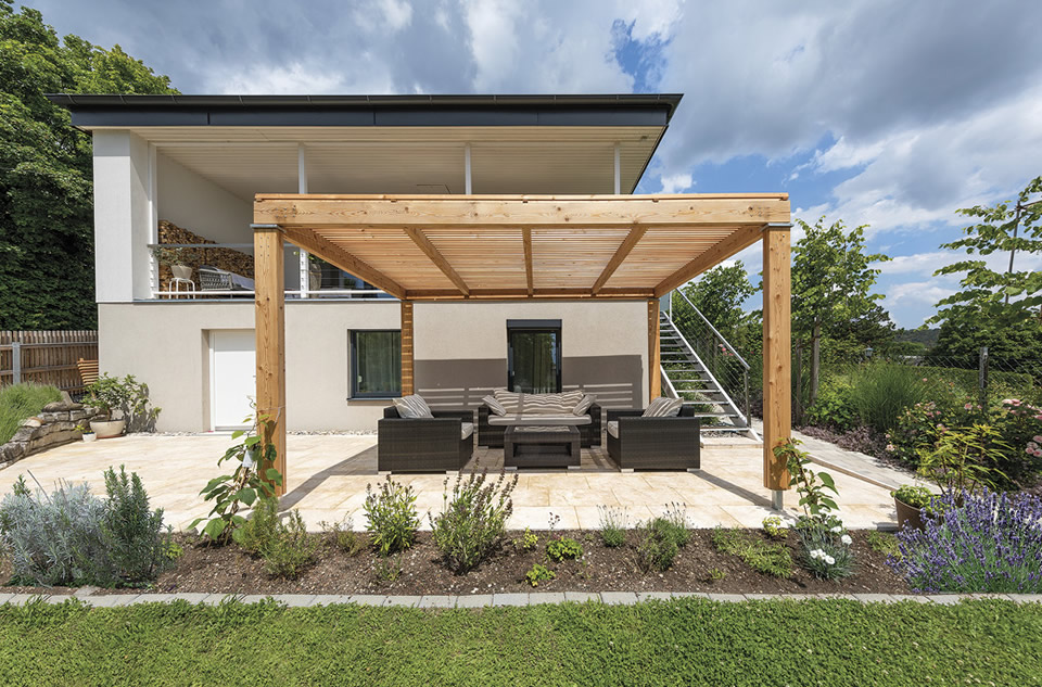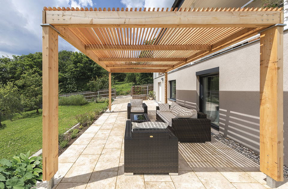 Nachdem 2022 30 Laufmeter Zaun mit einem herausnehmbaren Zaunfeld aufgestellt worden waren, folgte 2023 der Auftrag für eine Pergola. Dafür wurden die gleichen Latten wie für den Zaun montiert: Lärche, 2,5 × 4 cm. 15° schräggestellt sorgen sie für eine leichte Beschattung und ein schönes Lichtbild.