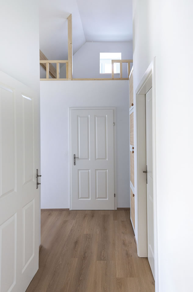 Keller, Außen- und Geschoßwände blieben erhalten. Die Tramdecke wurde durch Erlinger Holzbau