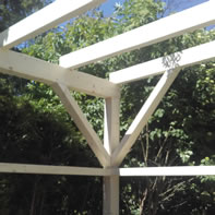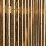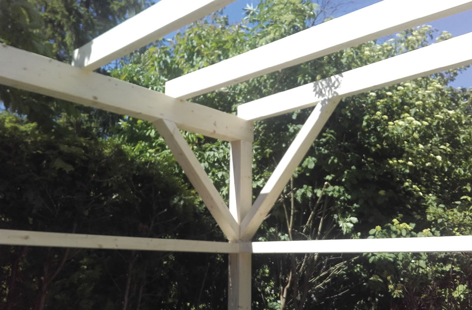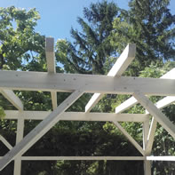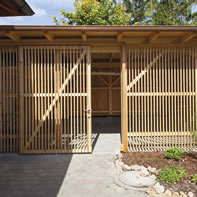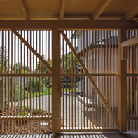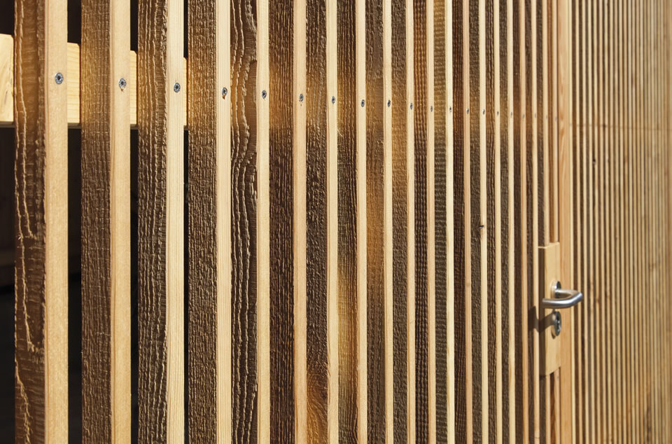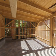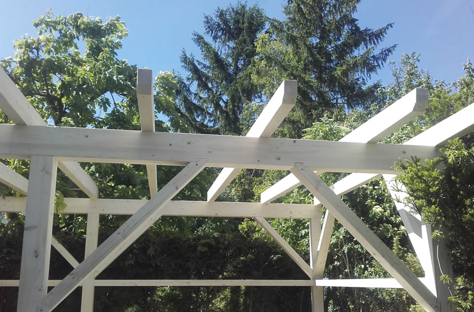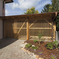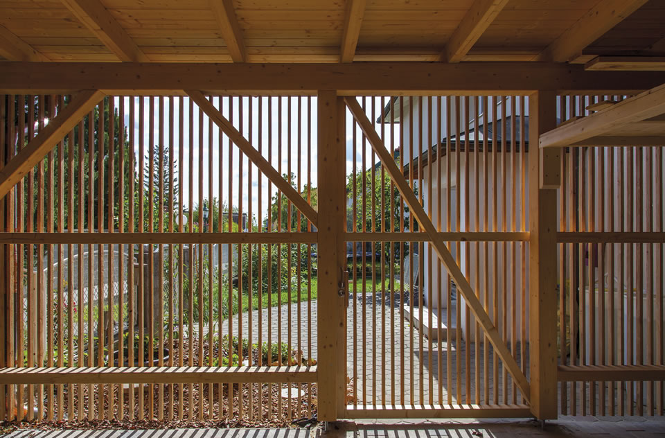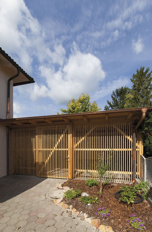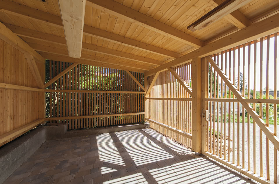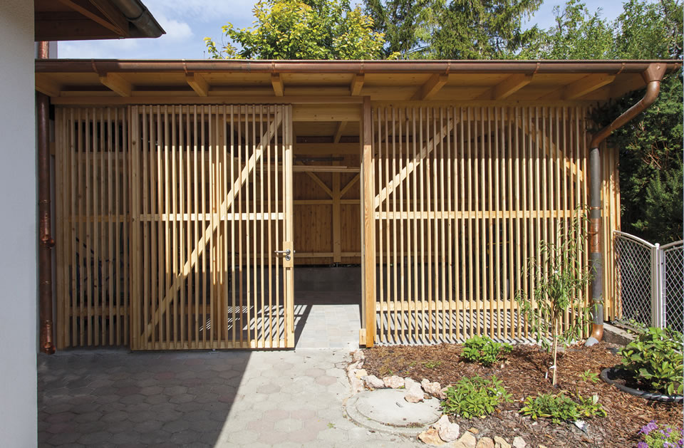 Einfache, gemäß lokalen Bauvorschriften an drei Seiten offene Überdachung (Gartenlaube, Carport, …) mit Gitterwand aus sägerauen, gebürsteten Lärchenlatten. Die Tragkonstruktion kommt ohne Metall aus, setzt stattdessen auf traditionelle Schwalbenschwanz-Holzverbindungen. Erlinger Holzbau fungierte hier als Bautischlerei inklusive Konstruktion und Montage der schönen Schiebetür.