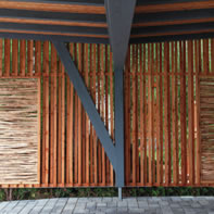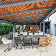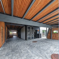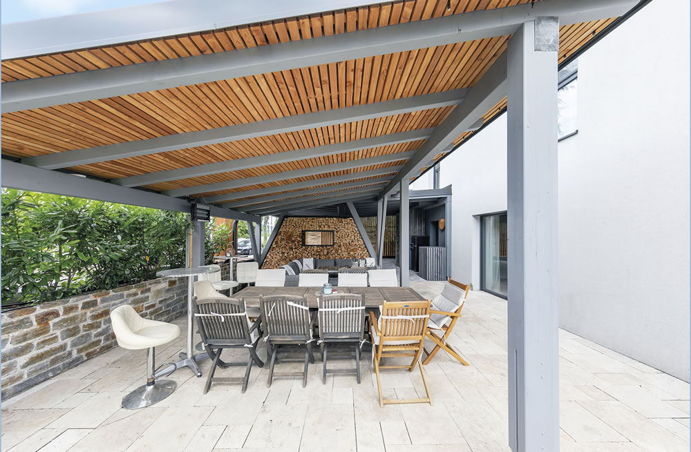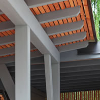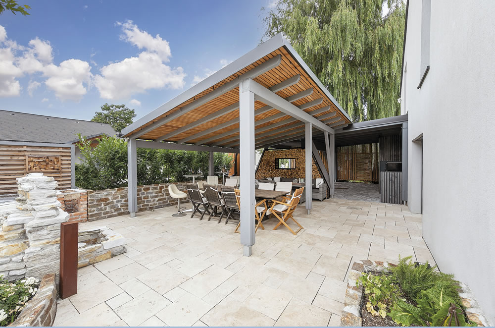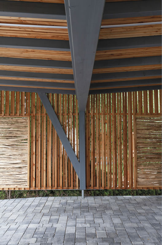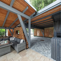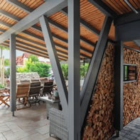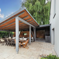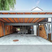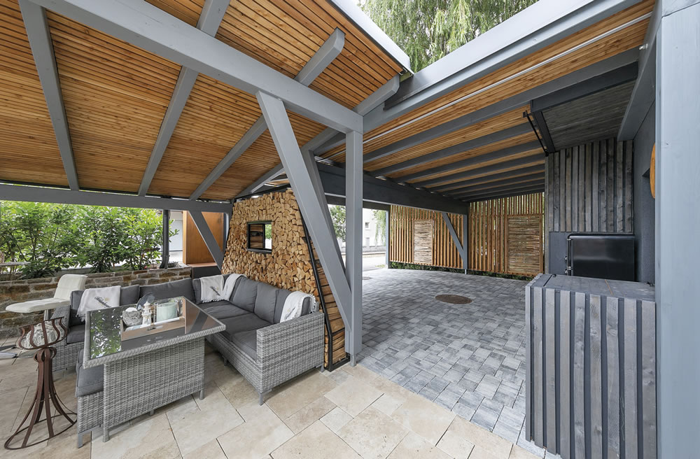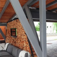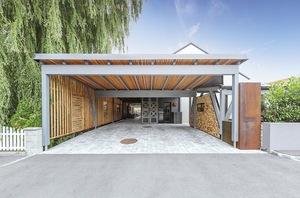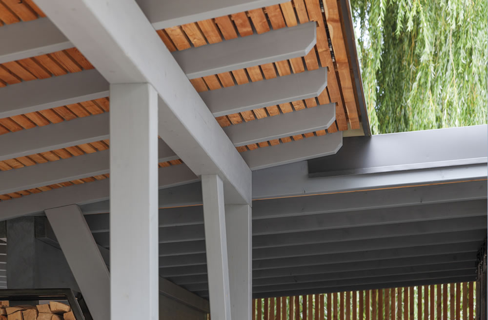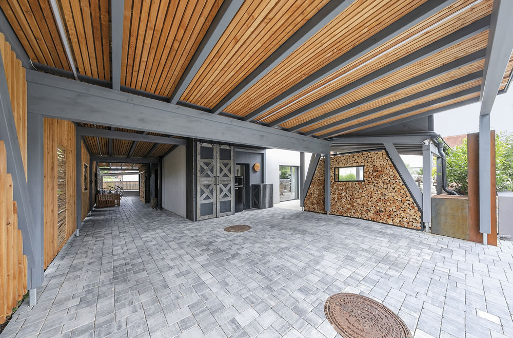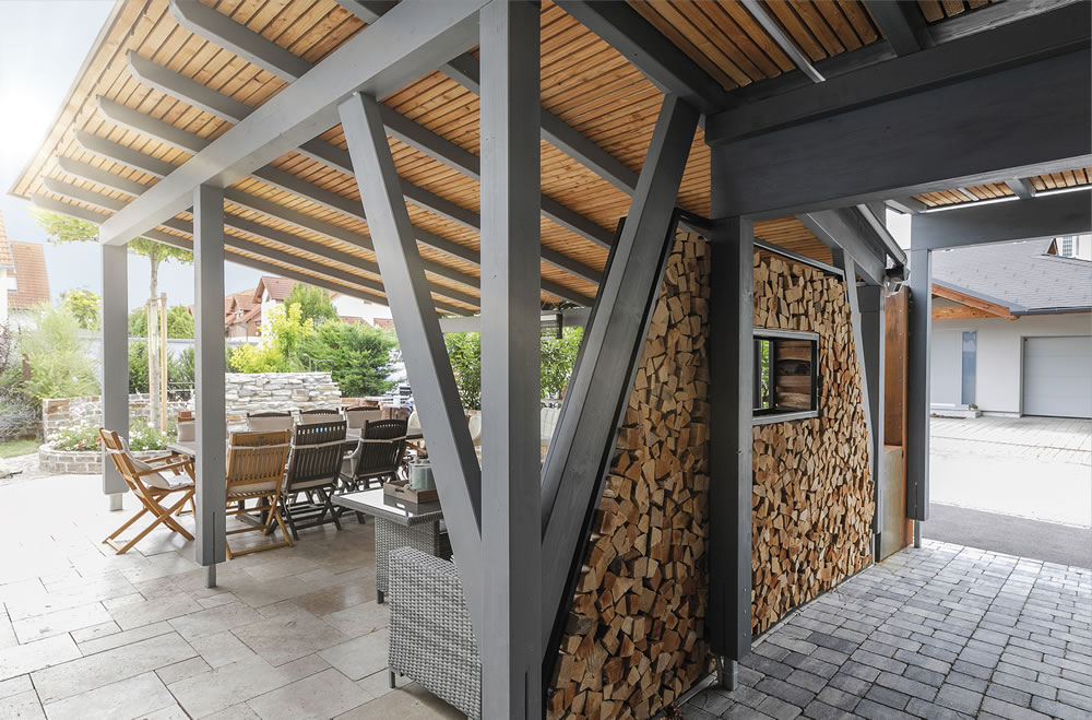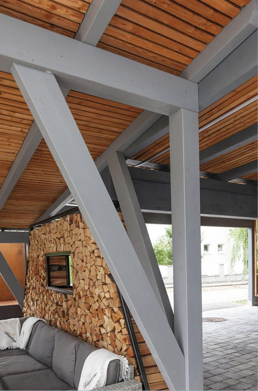 Erlinger Holzbau entwickelte eine überzeugende Gesamtlösung inklusive Adaptierungen im Ausführungsdesign und wurde mit dem Bau beauftragt. Carport und Eingangsüberdachung (zusammen 90 m2) wurden mit Satteldächern versehen, die Sitzplatzüberdachung (31 m2) mit einem Pultdach (Neigung 2°). Für die Dacheindeckung wählte man Bitumen, die Untersicht ist Lärche, die Balkenkonstruktion Fichte grau lasiert.