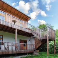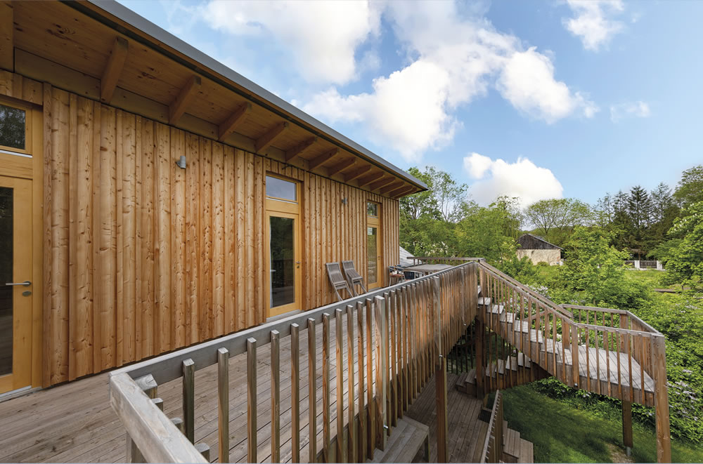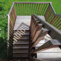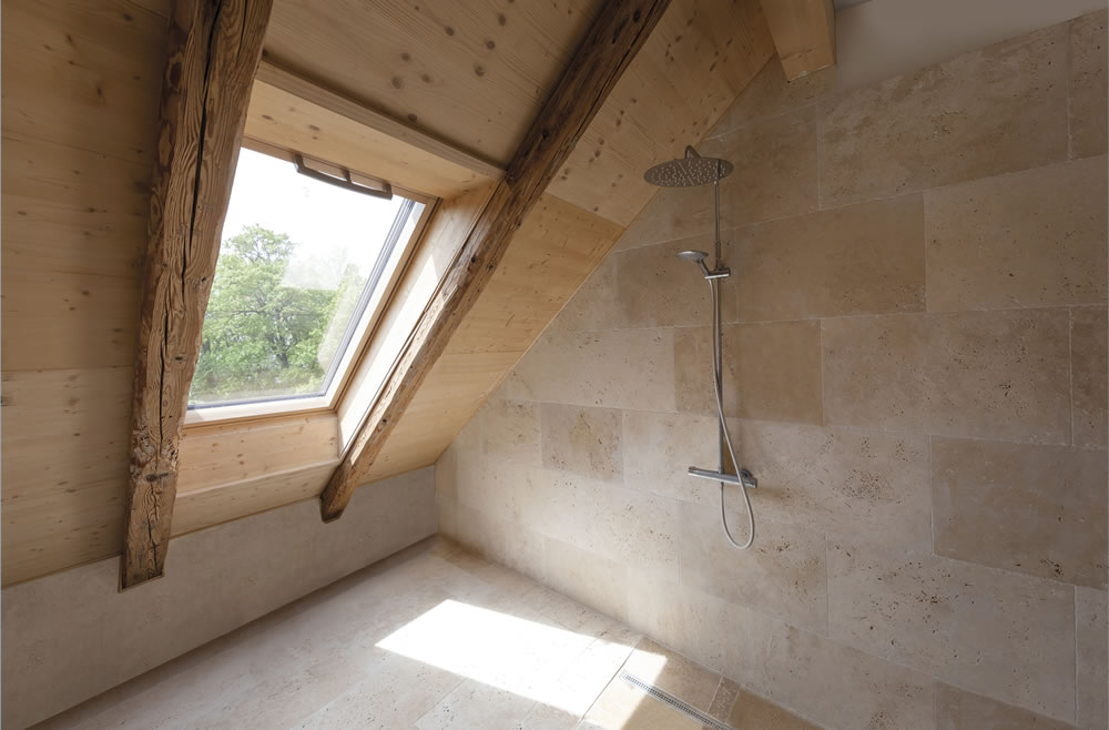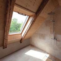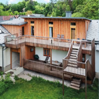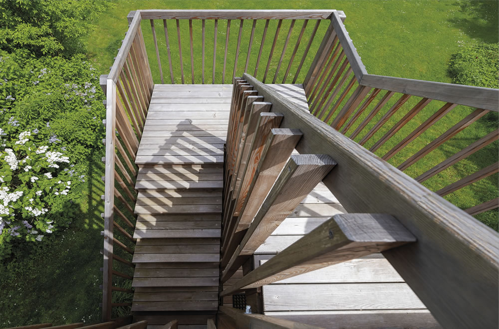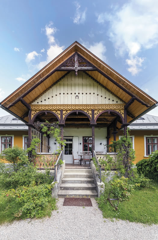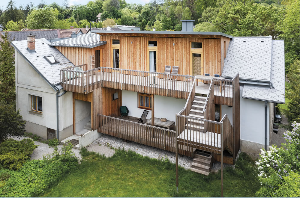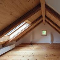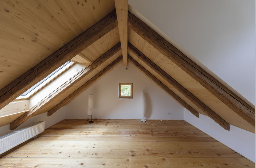 Der vom Bruder des Bauherrn geplante Umbau hatte zum Ziel, den Dachboden als zusätzlichen Wohnraum zu gewinnen. Dazu wurde das Bestandsdach mit Ausnahme der südseitigen Veranda komplett abgetragen, ein Zubau an die Verandakonstruktion angefügt und das Gebälk neu aufgebaut. Die noch funktionsfähigen der rund 125 Jahre alten Dachbalken wurden gereinigt, gebürstet und wiederverwendet. Schadhafte Bauteile wurden mit originalgetreuen Nachbauten ersetzt. Mit der vorgesetzten Terrassen-Treppen-Konstruktion schuf man weitere 62 m2 Wohnnutzfläche. Die Innenverkleidung der Dachschräge auf Dreischicht-Massivholzplatten (Fichte) und der Einbau der Dachflächenfenster vervollständigten das Projekt.